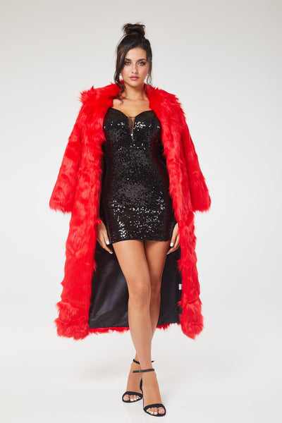 Break the rules and expectations with our brand new winter collection. We strive to make every piece of clothing something beautiful and sophisticated in its own right - it's what you deserve - and this piece is no exception! The formidable length and bold material makes for a powerful look, accentuated by the stunning red colour of the fur.
